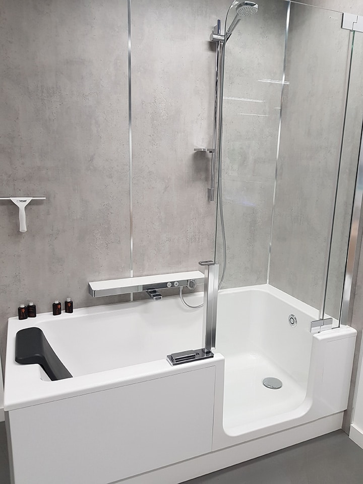 Un système de verrouillage empêche toute ouverture pendant le bain. Le combiné bain-douche accueille facilement un siège pour le confort des usagers. De plus, il est accessible pour les personnes âgées et à mobilité réduite (PMR).